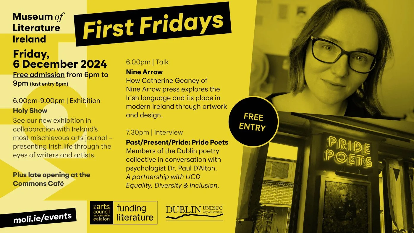 On Friday, 6 December 2024, the Museum of Literature hosts First Fridays, offering free admission and special programming from 6pm to 9pm. Visitors can explore the Holy Show exhibition, created in collaboration with Ireland's most mischievous arts journal, showcasing Irish life through the perspectives of writers and artists. At 6pm, Catherine Geaney of Nine Arrow Press will deliver a talk on how her work explores the Irish language's role in modern Ireland through art and design. At 7:30pm, the Dublin poetry collective Pride Poets—featuring Sonya Mulligan, Sara Ribeiro, and SJ Delaney—will join psychologist Dr. Paul D'Alton for a discussion as part of the Past/Present/Pride series, in partnership with UCD Equality, Diversity & Inclusion. Guests can also enjoy late-night offerings at the Commons Café.